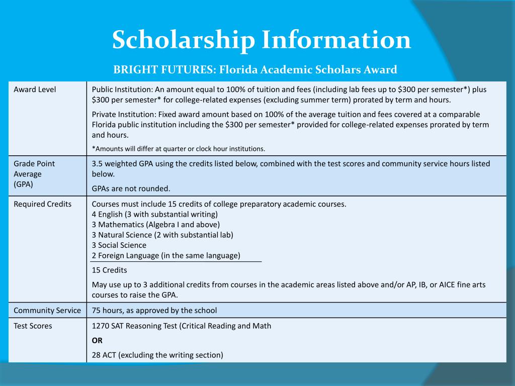 Scholarship Information BRIGHT FUTURES: Florida Academic Scholars Award