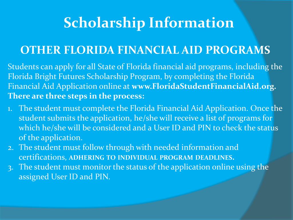 Scholarship Information OTHER FLORIDA FINANCIAL AID PROGRAMS Students can apply for all State of Florida financial aid programs, including the Florida Bright Futures Scholarship Program, by completing the Florida Financial Aid Application online at www.FloridaStudentFinancialAid.org. There are three steps in the process: The student must complete the Florida Financial Aid Application. Once the student submits the application, he/she will receive a list of programs for which he/she will be considered and a User ID and PIN to check the status of the application. The student must follow through with needed information and certifications, adhering to individual program deadlines. The student must monitor the status of the application online using the assigned User ID and PIN.