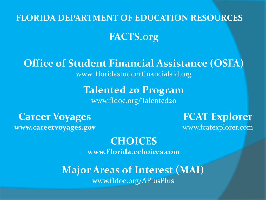 FLORIDA DEPARTMENT OF EDUCATION RESOURCES FACTS.org Office of Student Financial Assistance (OSFA) www. floridastudentfinancialaid.org Talented 20 Program www.fldoe.org/Talented20 Career Voyages www.careervoyages.gov FCAT Explorer www.fcatexplorer.com CHOICES www.Florida.echoices.com Major Areas of Interest (MAI) www.fldoe.org/APlusPlus
