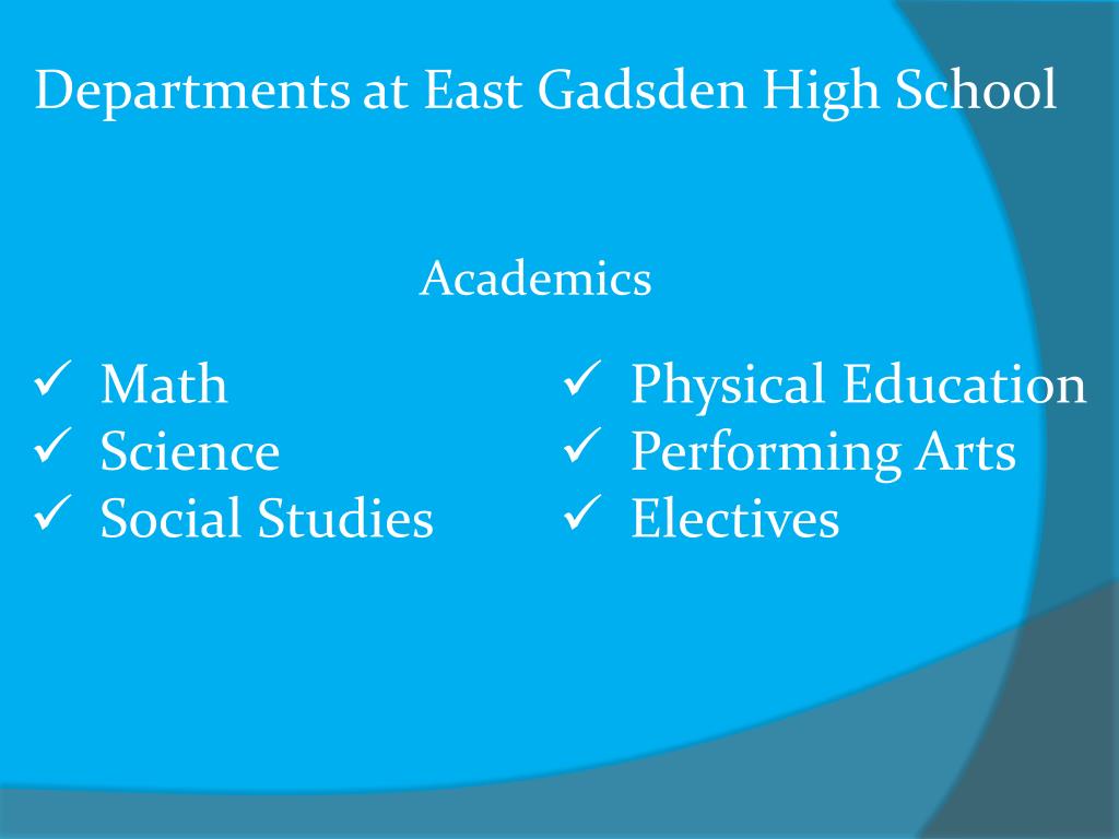 Departments at East Gadsden High School Academics • Math • Science • Social Studies • Physical Education • Performing Arts • Electives