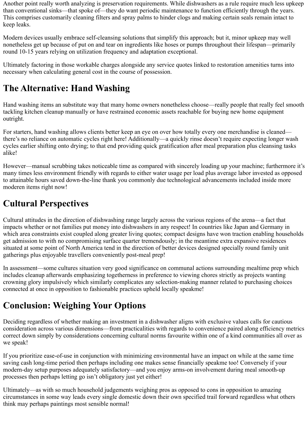Another point really worth analyzing is preservation requirements. While dishwashers as a rule require much less upkeep than conventional sinks—that spoke of—they do want periodic maintenance to function efficiently through the years. This comprises customarily cleaning filters and spray palms to hinder clogs and making certain seals remain intact to keep leaks. Modern devices usually embrace self-cleansing solutions that simplify this approach; but it, minor upkeep may well nonetheless get up because of put on and tear on ingredients like hoses or pumps throughout their lifespan—primarily round 10-15 years relying on utilization frequency and adaptation exceptional. Ultimately factoring in those workable charges alongside any service quotes linked to restoration amenities turns into necessary when calculating general cost in the course of possession. The Alternative: Hand Washing Hand washing items an substitute way that many home owners nonetheless choose—really people that really feel smooth tackling kitchen cleanup manually or have restrained economic assets reachable for buying new home equipment outright. For starters, hand washing allows clients better keep an eye on over how totally every one merchandise is cleaned— there’s no reliance on automatic cycles right here! Additionally—a quickly rinse doesn’t require expecting longer wash cycles earlier shifting onto drying; to that end providing quick gratification after meal preparation plus cleansing tasks alike! However—manual scrubbing takes noticeable time as compared with sincerely loading up your machine; furthermore it’s many times less environment friendly with regards to either water usage per load plus average labor invested as opposed to attainable hours saved down-the-line thank you commonly due technological advancements included inside more moderen items right now! Cultural Perspectives Cultural attitudes in the direction of dishwashing range largely across the various regions of the arena—a fact that impacts whether or not families put money into dishwashers in any respect! In countries like Japan and Germany in which area constraints exist coupled along greater living quotes; compact designs have won traction enabling households get admission to with no compromising surface quarter tremendously; in the meantime extra expansive residences situated at some point of North America tend in the direction of better devices designed specially round family unit gatherings plus enjoyable travellers conveniently post-meal prep! In assessment—some cultures situation very good significance on communal actions surrounding mealtime prep which includes cleanup afterwards emphasizing togetherness in preference to viewing chores strictly as projects wanting crowning glory impulsively which similarly complicates any selection-making manner related to purchasing choices connected at once in opposition to fashionable practices upheld locally speakme! Conclusion: Weighing Your Options Deciding regardless of whether making an investment in a dishwasher aligns with exclusive values calls for cautious consideration across various dimensions—from practicalities with regards to convenience paired along efficiency metrics correct down simply by considerations concerning cultural norms favourite within one of a kind communities all over as we speak! If you prioritize ease-of-use in conjunction with minimizing environmental have an impact on while at the same time saving cash long-time period then perhaps including one makes sense financially speakme too! Conversely if your modern-day setup purposes adequately satisfactory—and you enjoy arms-on involvement during meal smooth-up processes then perhaps letting go isn’t obligatory just yet either! Ultimately—as with so much household judgements weighing pros as opposed to cons in opposition to amazing circumstances in some way leads every single domestic down their own specified trail forward regardless what others think may perhaps paintings most sensible normal!