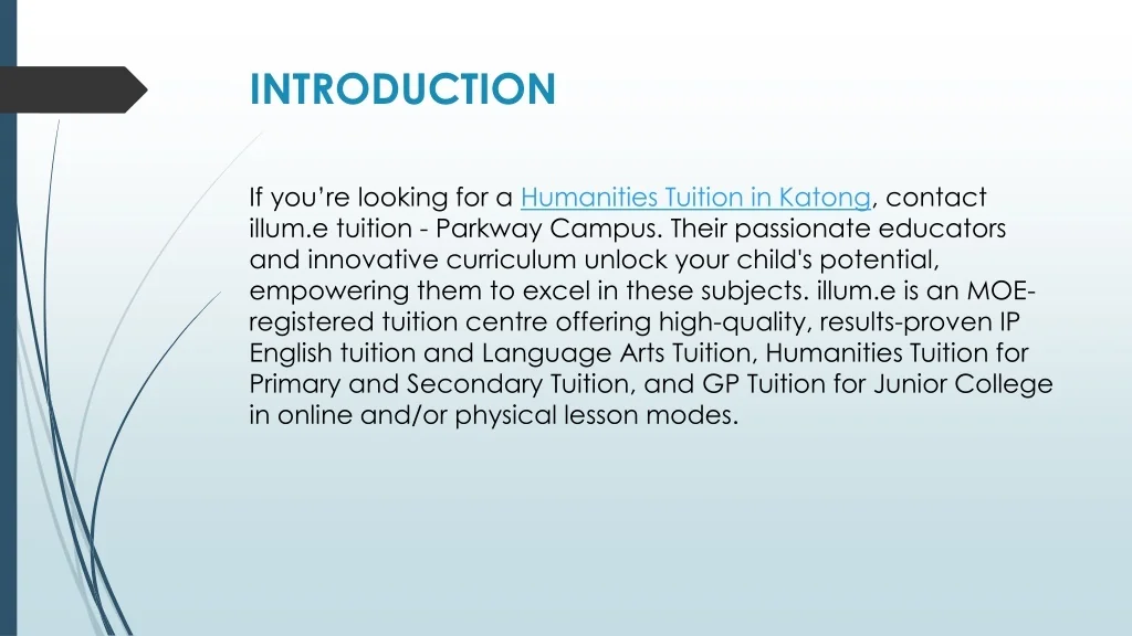 If youu2019re looking for Humanities Tuition in Katong, contact illum.e tuition - Parkway Campus. Their passionate educators and innovative curriculum unlock your child's potential, empowering them to excel in these subjects. illum.e is a MOE-registered tuition center offering high-quality, results-proven IP English tuition and Language Arts, Humanities Tuition for Primary and Secondary Tuition, and GP Tuition for Junior College in online and physical lesson modes. Visit-https://maps.app.goo.gl/8imHNNoLFLWGf8VRA