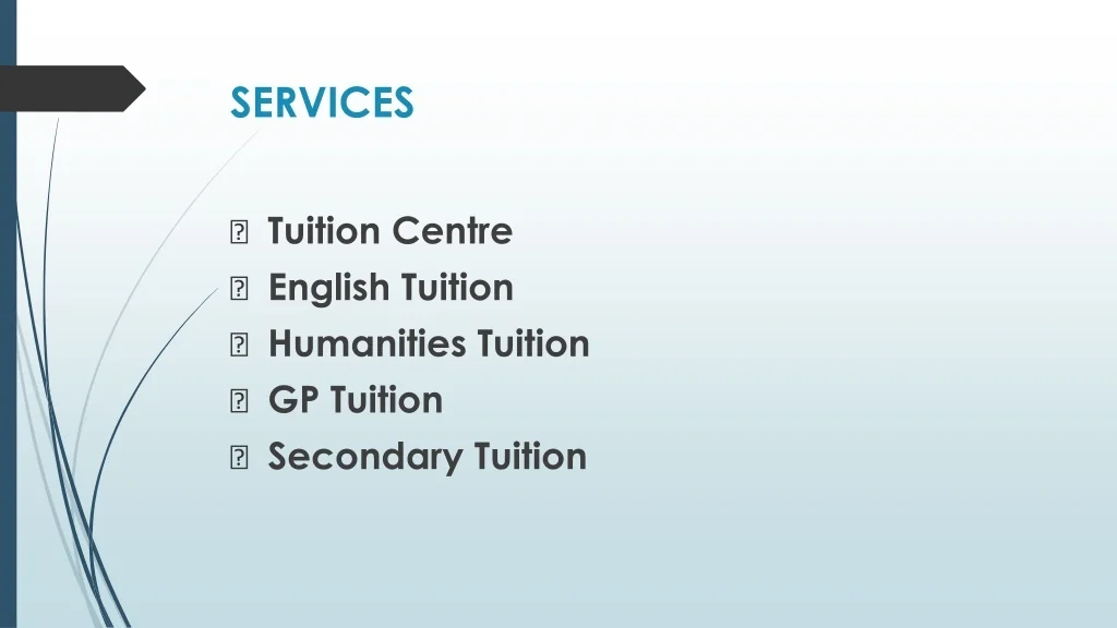 SERVICES • Tuition Centre • English Tuition • Humanities Tuition • GP Tuition • Secondary Tuition
