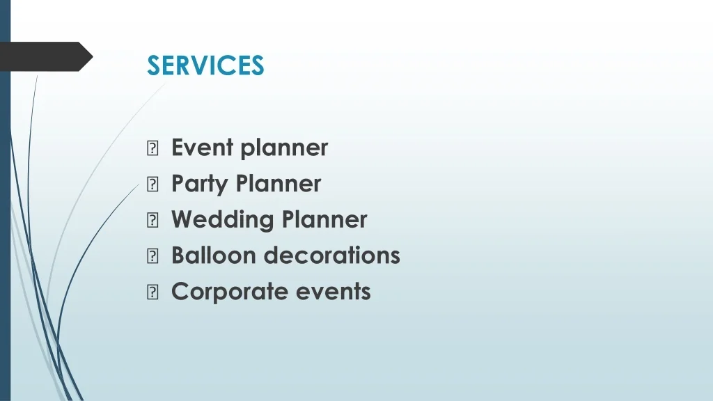 SERVICES • Event planner • Party Planner • Wedding Planner • Balloon decorations • Corporate events
