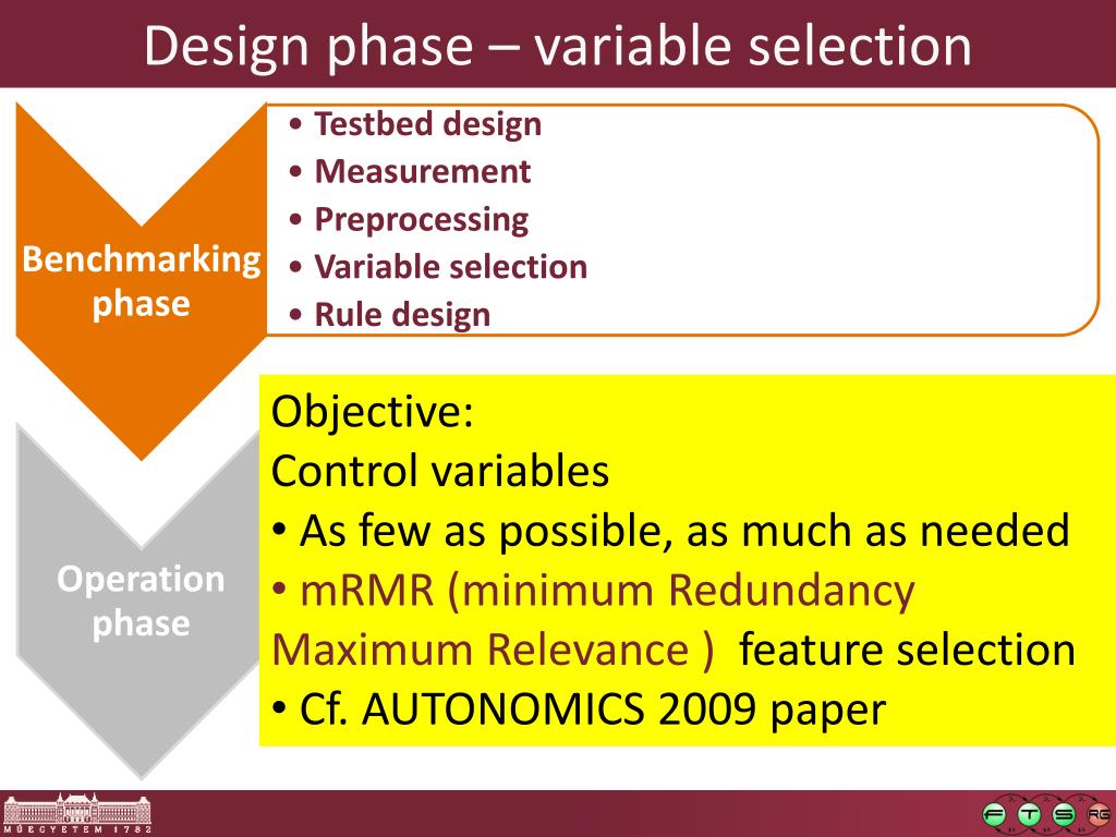 Design phase – variable selection • Objective: • Control variables • As few as possible, as much as needed • mRMR (minimum Redundancy Maximum Relevance ) feature selection • Cf. AUTONOMICS 2009 paper