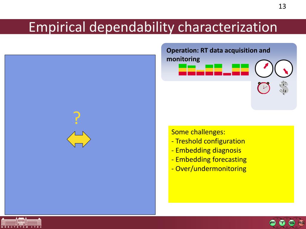 Empiricaldependabilitycharacterization Operation: RTdata acquisition and monitoring ? • Somechallenges: • Tresholdconfiguration • Embeddingdiagnosis • Embeddingforecasting • Over/undermonitoring