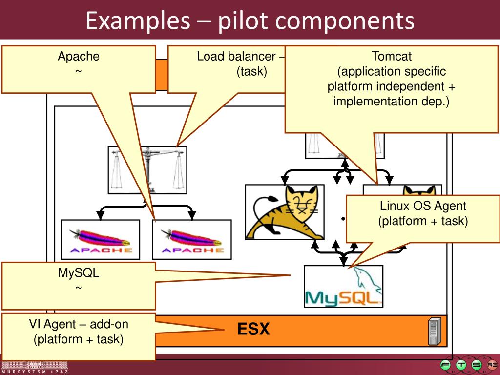 Examples – pilot components Apache ~ Loadbalancer – UA (task) Tomcat (applicationspecific platform independent + implementationdep.) Linux OS Agent (platform + task) MySQL ~ VI Agent – add-on (platform + task)