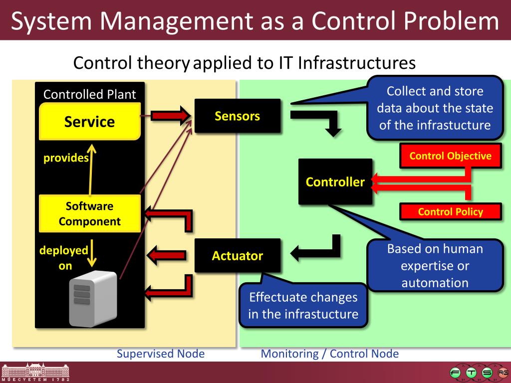 System Management as a Control Problem Control theory applied to IT Infrastructures Collect and store data about the state of the infrastucture Controlled Plant Monitoring Sensors Service Control Objective provides Controller Decision Making Software Component Control Policy Actuator Provisioning Based on human expertise or automation deployed on Effectuate changes in the infrastucture Supervised Node Monitoring / Control Node