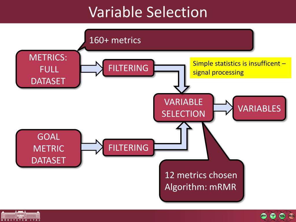 Variable Selection 160+ metrics METRICS: FULL DATASET Simplestatistics is insufficent – signalprocessing FILTERING VARIABLE SELECTION VARIABLES GOAL METRIC DATASET FILTERING 12 metricschosen Algorithm: mRMR