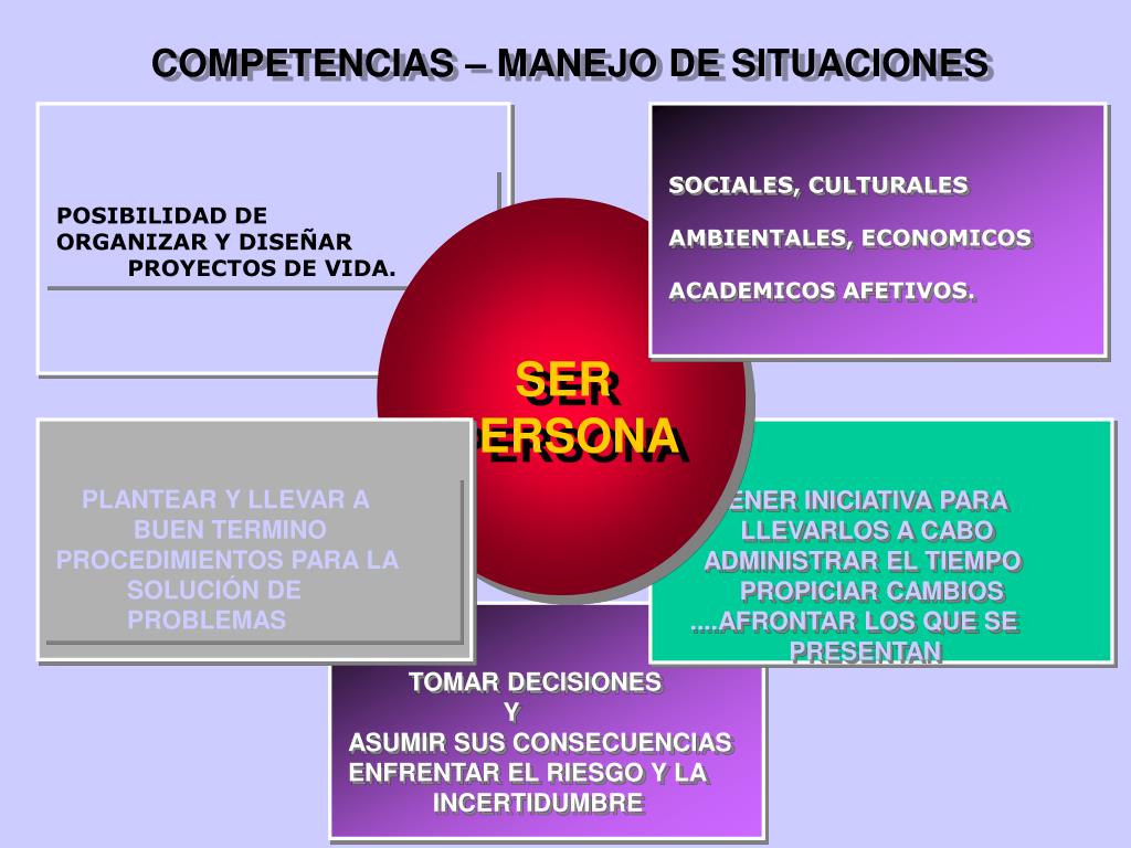 POSIBILIDAD DE ORGANIZAR Y DISEÑAR PROYECTOS DE VIDA. SOCIALES, CULTURALES AMBIENTALES, ECONOMICOS ACADEMICOS AFETIVOS. TOMAR DECISIONES Y ASUMIR SUS CONSECUENCIAS ENFRENTAR EL RIESGO Y LA INCERTIDUMBRE TENER INICIATIVA PARA LLEVARLOS A CABO ADMINISTRAR EL TIEMPO PROPICIAR CAMBIOS ....AFRONTAR LOS QUE SE PRESENTAN PLANTEAR Y LLEVAR A BUEN TERMINO PROCEDIMIENTOS PARA LA SOLUCIÓN DE PROBLEMAS SER PERSONA COMPETENCIAS – MANEJO DE SITUACIONES