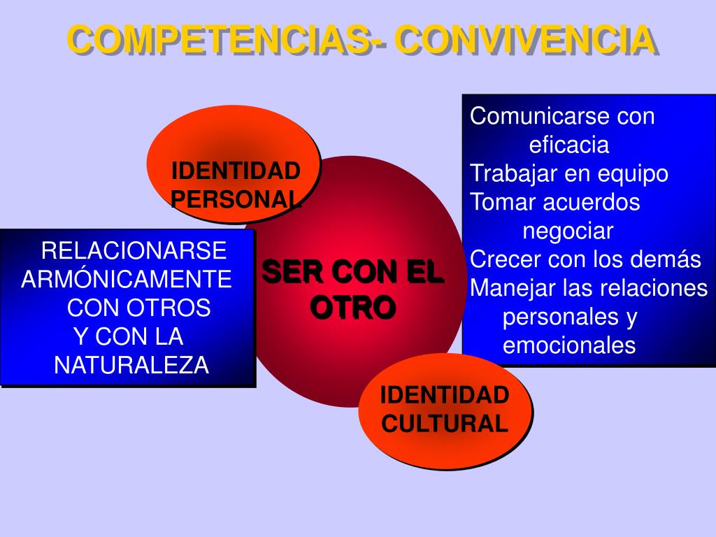 IDENTIDAD PERSONAL IDENTIDAD CULTURAL SER CON EL OTRO COMPETENCIAS- CONVIVENCIA Comunicarse con eficacia Trabajar en equipo Tomar acuerdos negociar Crecer con los demás Manejar las relaciones personales y emocionales RELACIONARSE ARMÓNICAMENTE CON OTROS Y CON LA NATURALEZA