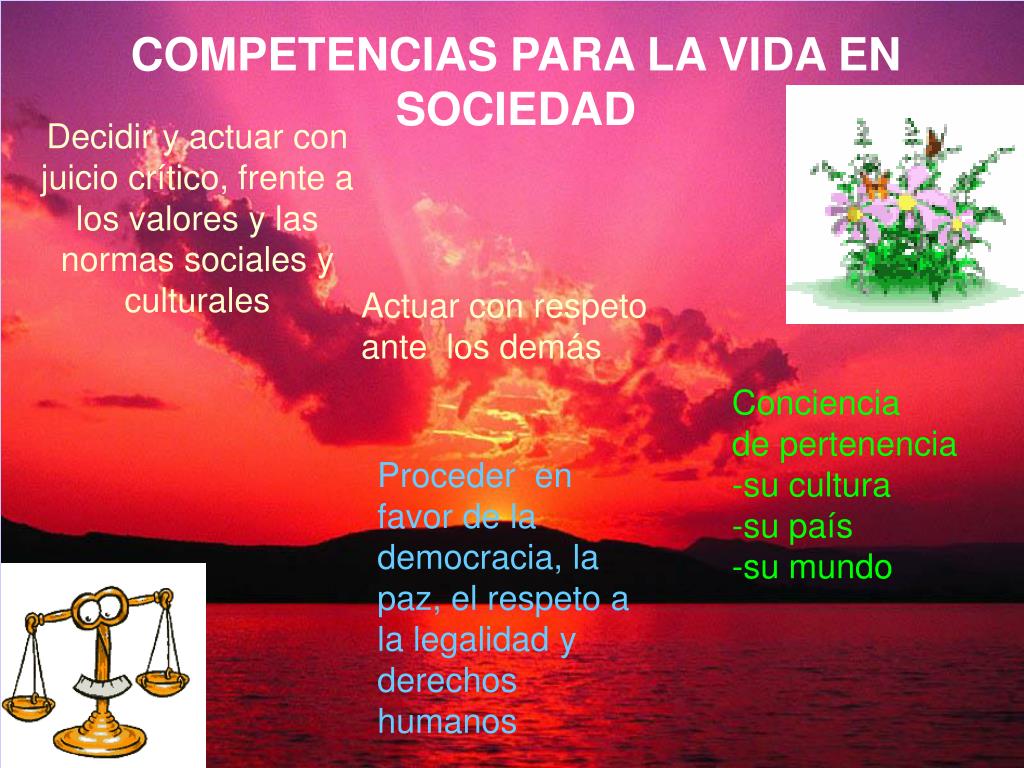 COMPETENCIAS PARA LA VIDA EN SOCIEDAD Decidir y actuar con juicio crítico, frente a los valores y las normas sociales y culturales Actuar con respeto ante los demás Conciencia de pertenencia -su cultura -su país -su mundo Proceder en favor de la democracia, la paz, el respeto a la legalidad y derechos humanos