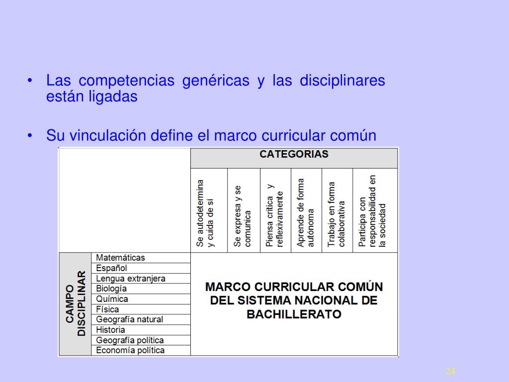 Las competencias genéricas y las disciplinares están ligadas Su vinculación define el marco curricular común 24