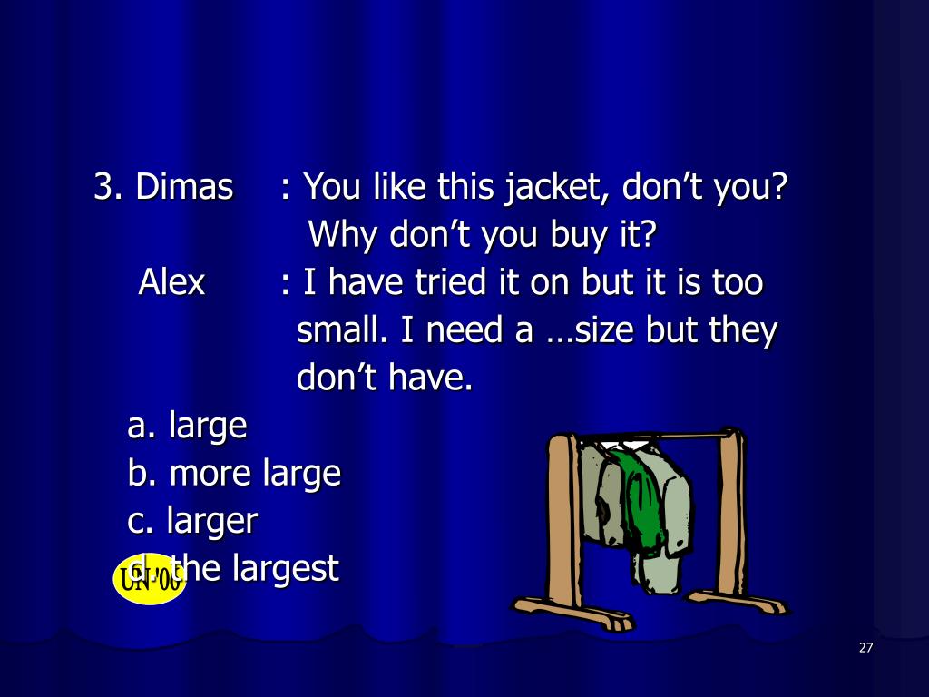 3. Dimas : You like this jacket, don’t you? Why don’t you buy it? Alex : I have tried it on but it is too small. I need a …size but they don’t have. a. large b. more large c. larger d. the largest
