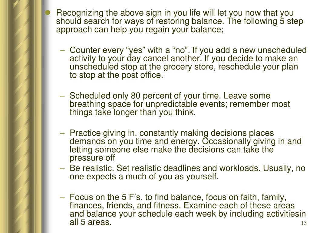Recognizing the above sign in you life will let you now that you should search for ways of restoring balance. The following 5 step approach can help you regain your balance; • Counter every “yes” with a “no”. If you add a new unscheduled activity to your day cancel another. If you decide to make an unscheduled stop at the grocery store, reschedule your plan to stop at the post office. • Scheduled only 80 percent of your time. Leave some breathing space for unpredictable events; remember most things take longer than you think. • Practice giving in. constantly making decisions places demands on you time and energy. Occasionally giving in and letting someone else make the decisions can take the pressure off • Be realistic. Set realistic deadlines and workloads. Usually, no one expects a much of you as yourself. • Focus on the 5 F’s. to find balance, focus on faith, family, finances, friends, and fitness. Examine each of these areas and balance your schedule each week by including activitiesin all 5 areas.
