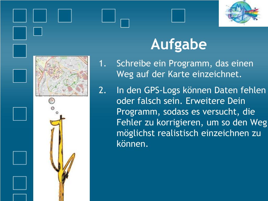 Aufgabe • Schreibe ein Programm, das einen Weg auf der Karte einzeichnet. • In den GPS-Logs können Daten fehlen oder falsch sein. Erweitere Dein Programm, sodass es versucht, die Fehler zu korrigieren, um so den Weg möglichst realistisch einzeichnen zu können.