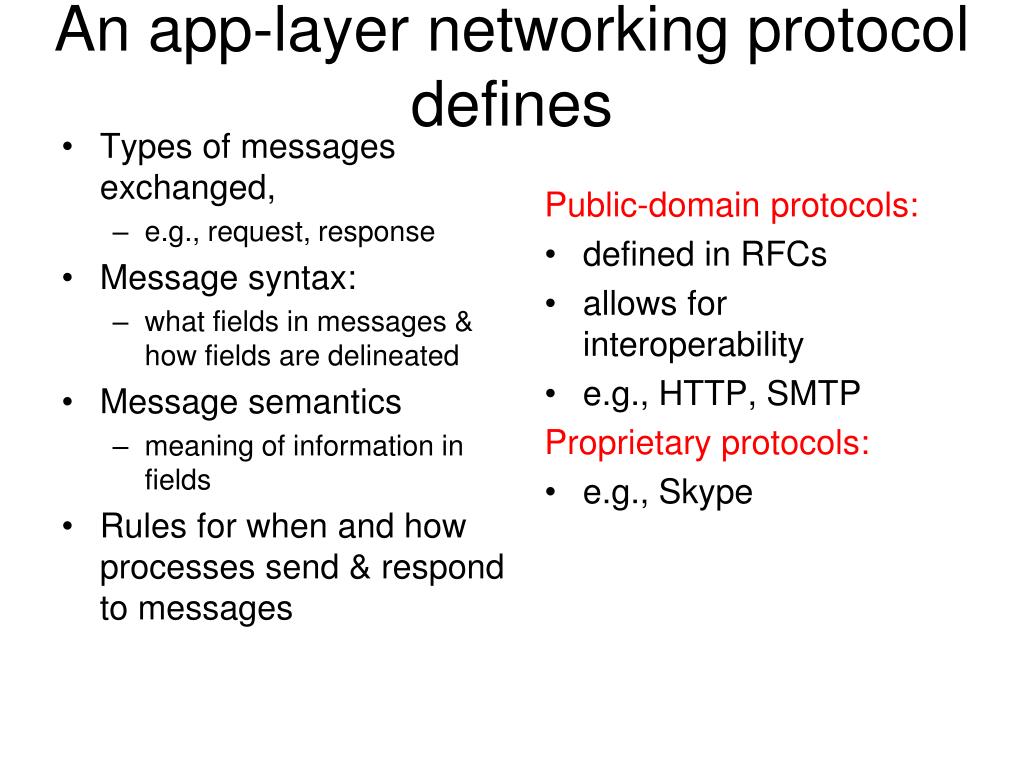 An app-layer networking protocol defines Types of messages exchanged, e.g., request, response Message syntax: what fields in messages & how fields are delineated Message semantics meaning of information in fields Rules for when and how processes send & respond to messages Public-domain protocols: defined in RFCs allows for interoperability e.g., HTTP, SMTP Proprietary protocols: e.g., Skype