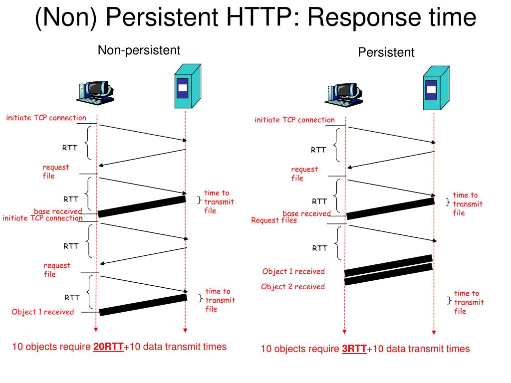 Non-Persistent HTTP: Response time time to transmit file Definition of RTT: time for a small packet to travel from client to server and back. Response time: • one RTT to initiate TCP connection • one RTT for HTTP request and first few bytes of HTTP response to return • file transmission time total = 2RTT + data transmit time 10 objects require 20RTT+10 data transmit times initiate TCP connection RTT request file RTT file received time time