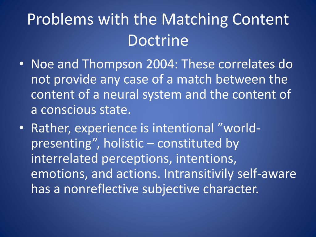 Problems with the MatchingContentDoctrine • Noe and Thompson 2004: Thesecorrelates do not provideanycaseof a match between the contentof a neural system and the contentof a consciousstate. • Rather, experience is intentional ”world-presenting”, holistic – constituted by interrelated perceptions, intentions, emotions, and actions. Intransitivilyself-aware has a nonreflectivesubjectivecharacter.