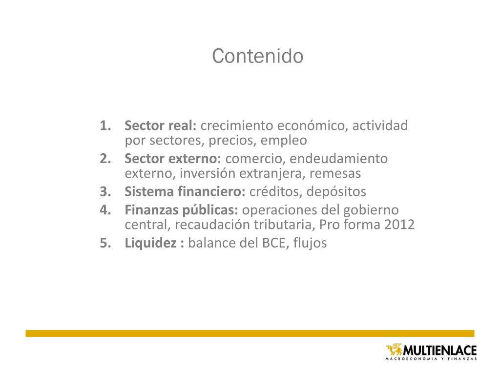 Contenido • Sector real: crecimiento económico, actividad por sectores, precios, empleo • Sector externo: comercio, endeudamiento externo, inversión extranjera, remesas • Sistema financiero: créditos, depósitos • Finanzas públicas: operaciones del gobierno central, recaudación tributaria, Pro forma 2012 • Liquidez : balance del BCE, flujos