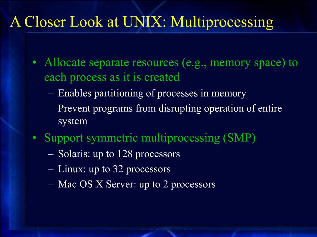 A Closer Look at UNIX: Multiprocessing • Allocate separate resources (e.g., memory space) to each process as it is created • Enables partitioning of processes in memory • Prevent programs from disrupting operation of entire system • Support symmetric multiprocessing (SMP) • Solaris: up to 128 processors • Linux: up to 32 processors • Mac OS X Server: up to 2 processors