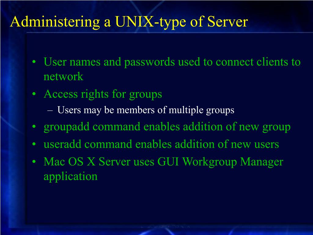 Administering a UNIX-type of Server • User names and passwords used to connect clients to network • Access rights for groups • Users may be members of multiple groups • groupadd command enables addition of new group • useradd command enables addition of new users • Mac OS X Server uses GUI Workgroup Manager application