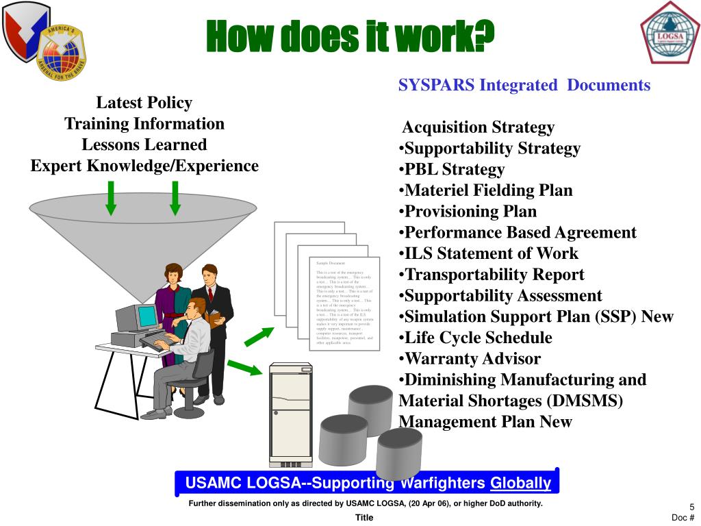 How does it work? • SYSPARS Integrated Documents • Acquisition Strategy • Supportability Strategy • PBL Strategy • Materiel Fielding Plan • Provisioning Plan • Performance Based Agreement • ILS Statement of Work • Transportability Report • Supportability Assessment • Simulation Support Plan (SSP) New • Life Cycle Schedule • Warranty Advisor • Diminishing Manufacturing and Material Shortages (DMSMS) Management Plan New Latest Policy Training Information Lessons Learned Expert Knowledge/Experience Sample Document This is a test of the emergency broadcasting system… This is only a test… This is a test of the emergency broadcasting system… This is only a test… This is a test of the emergency broadcasting system… This is only a test… This is a test of the emergency broadcasting system… This is only a test… This is a test of the ILS supportability of any weapon system makes it very important to provide supply support, maintenance , computer resources, transport facilities, manpower, personnel, and other applicable areas.