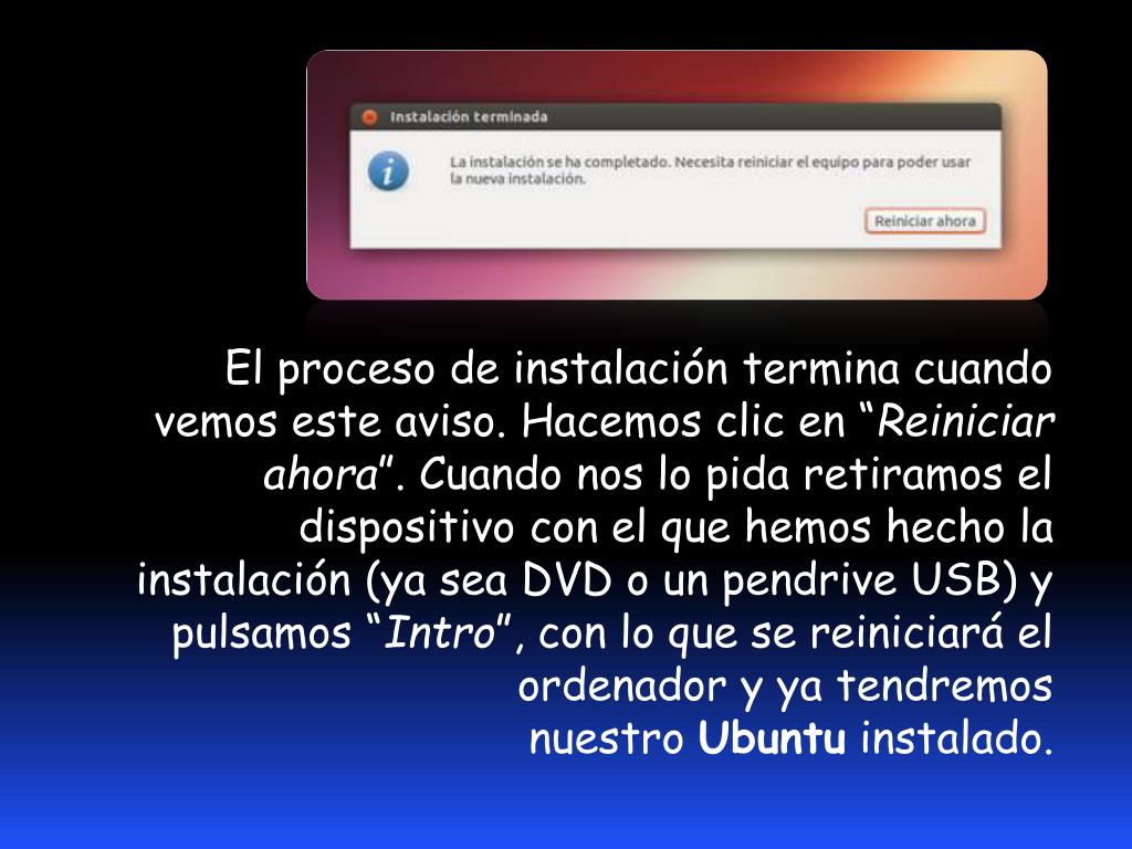 El proceso de instalación termina cuando vemos este aviso. Hacemos clic en “Reiniciar ahora”. Cuando nos lo pida retiramos el dispositivo con el que hemos hecho la instalación (ya sea DVD o un pendrive USB) y pulsamos “Intro”, con lo que se reiniciará el ordenador y ya tendremos nuestro Ubuntu instalado.