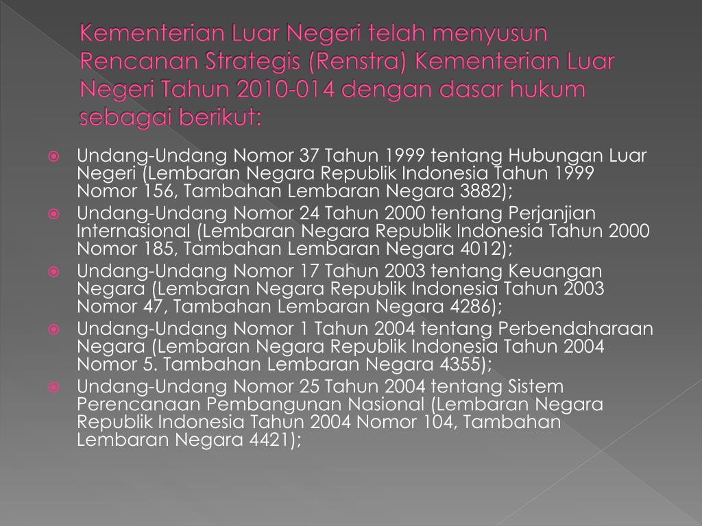 KementerianLuarNegeritelahmenyusunRencananStrategis (Renstra) KementerianLuarNegeriTahun 2010-014 dengandasarhukumsebagaiberikut: • Undang-UndangNomor 37 Tahun 1999 tentangHubunganLuarNegeri (Lembaran Negara Republik Indonesia Tahun 1999 Nomor 156, TambahanLembaran Negara 3882); • Undang-UndangNomor 24 Tahun 2000 tentangPerjanjianInternasional (Lembaran Negara Republik Indonesia Tahun 2000 Nomor 185, TambahanLembaran Negara 4012); • Undang-UndangNomor 17 Tahun 2003 tentangKeuangan Negara (Lembaran Negara Republik Indonesia Tahun 2003 Nomor 47, TambahanLembaran Negara 4286); • Undang-UndangNomor 1 Tahun 2004 tentangPerbendaharaan Negara (Lembaran Negara Republik Indonesia Tahun 2004 Nomor 5. TambahanLembaran Negara 4355); • Undang-UndangNomor 25 Tahun 2004 tentangSistemPerencanaan Pembangunan Nasional (Lembaran Negara Republik Indonesia Tahun 2004 Nomor 104, TambahanLembaran Negara 4421);