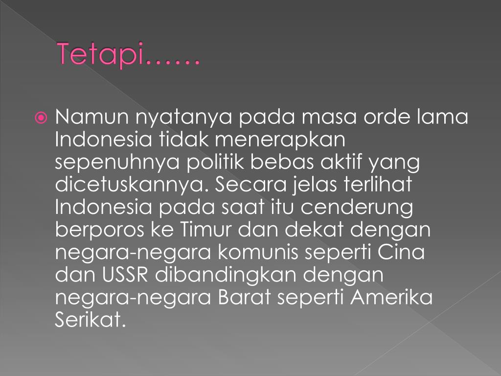 Tetapi…… • Namunnyatanyapadamasaorde lama Indonesia tidakmenerapkansepenuhnyapolitikbebasaktif yang dicetuskannya. Secarajelasterlihat Indonesia padasaatitucenderungberporoskeTimurdandekatdengannegara-negarakomunissepertiCinadan USSR dibandingkandengannegara-negara Barat sepertiAmerikaSerikat.