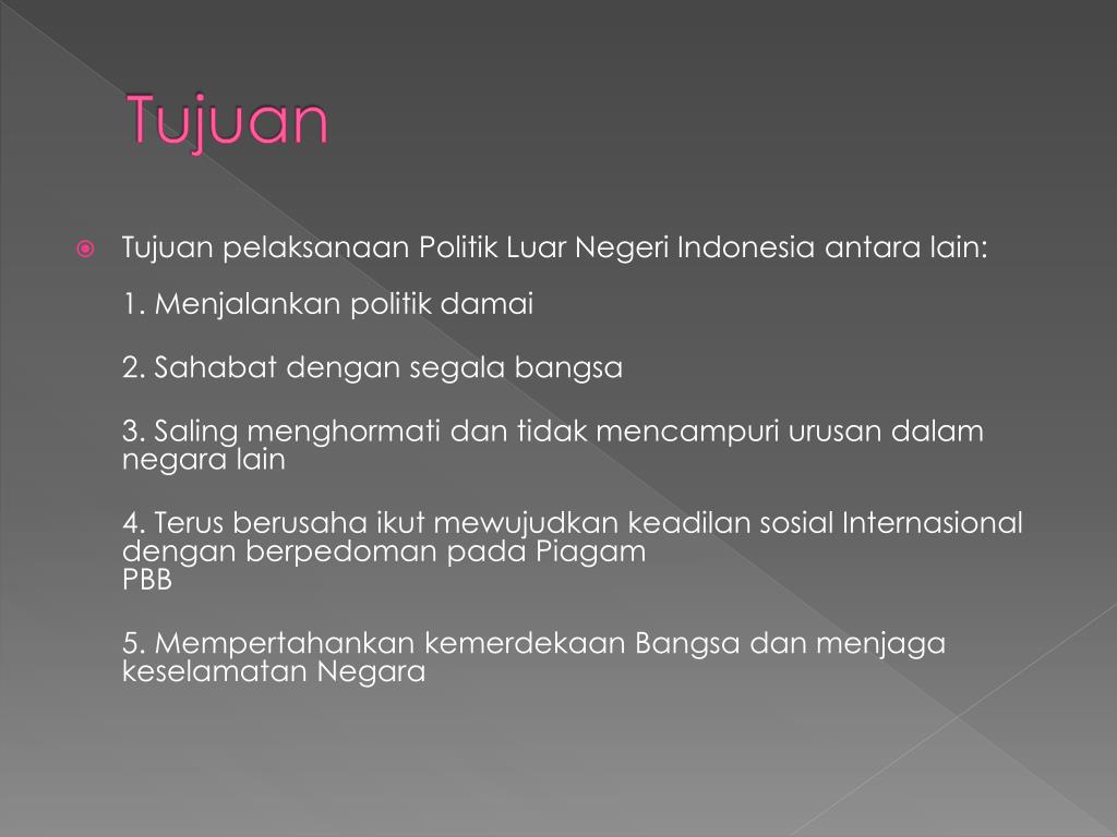 Tujuan • TujuanpelaksanaanPolitikLuarNegeri Indonesia antara lain:1. Menjalankanpolitikdamai 2. Sahabatdengansegalabangsa 3. Salingmenghormatidantidakmencampuriurusandalamnegara lain 4. TerusberusahaikutmewujudkankeadilansosialInternasionaldenganberpedomanpadaPiagamPBB 5. MempertahankankemerdekaanBangsadanmenjagakeselamatan Negara