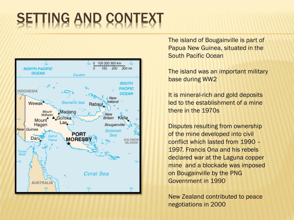 Setting and context The island of Bougainville is part of Papua New Guinea, situated in the South Pacific Ocean The island was an important military base during WW2 It is mineral-rich and gold deposits led to the establishment of a mine there in the 1970s Disputes resulting from ownership of the mine developed into civil conflict which lasted from 1990 – 1997. Francis Ona and his rebels declared war at the Laguna copper mine and a blockade was imposed on Bougainville by the PNG Government in 1990 New Zealand contributed to peace negotiations in 2000