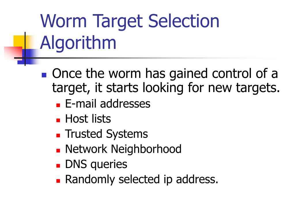Worm Target Selection Algorithm • Once the worm has gained control of a target, it starts looking for new targets. • E-mail addresses • Host lists • Trusted Systems • Network Neighborhood • DNS queries • Randomly selected ip address.