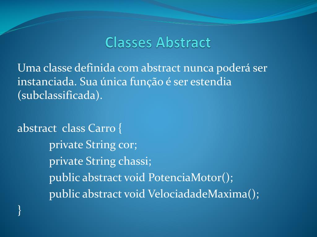 Classes Abstract Uma classe definida com abstract nunca poderá ser instanciada. Sua única função é ser estendia (subclassificada). abstract class Carro { private String cor; private String chassi; public abstract voidPotenciaMotor(); public abstract voidVelociadadeMaxima(); }