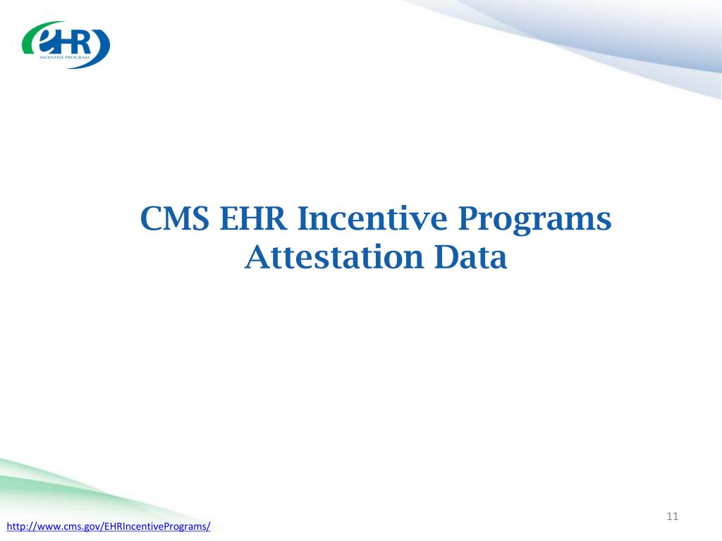 Providers Included • This data-only analysis shows our earliest adopters who have attested, but does not inform us on barriers to attestation. • At the time of the analysis • 58,063 EPs had attested • 57,765 Successfully • 298 Unsuccessfully (146 EPs have resubmitted successfully) • 1,061 Hospital had attested • All successfully