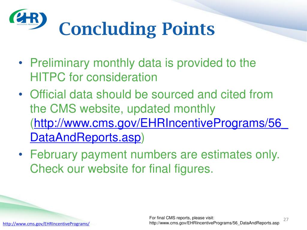 Concluding Points • Preliminary monthly data is provided to the HITPC for consideration • Official data should be sourced and cited from the CMS website, updated monthly (http://www.cms.gov/EHRIncentivePrograms/56_DataAndReports.asp) • February payment numbers are estimates only. Check our website for final figures. For final CMS reports, please visit: http://www.cms.gov/EHRIncentivePrograms/56_DataAndReports.asp