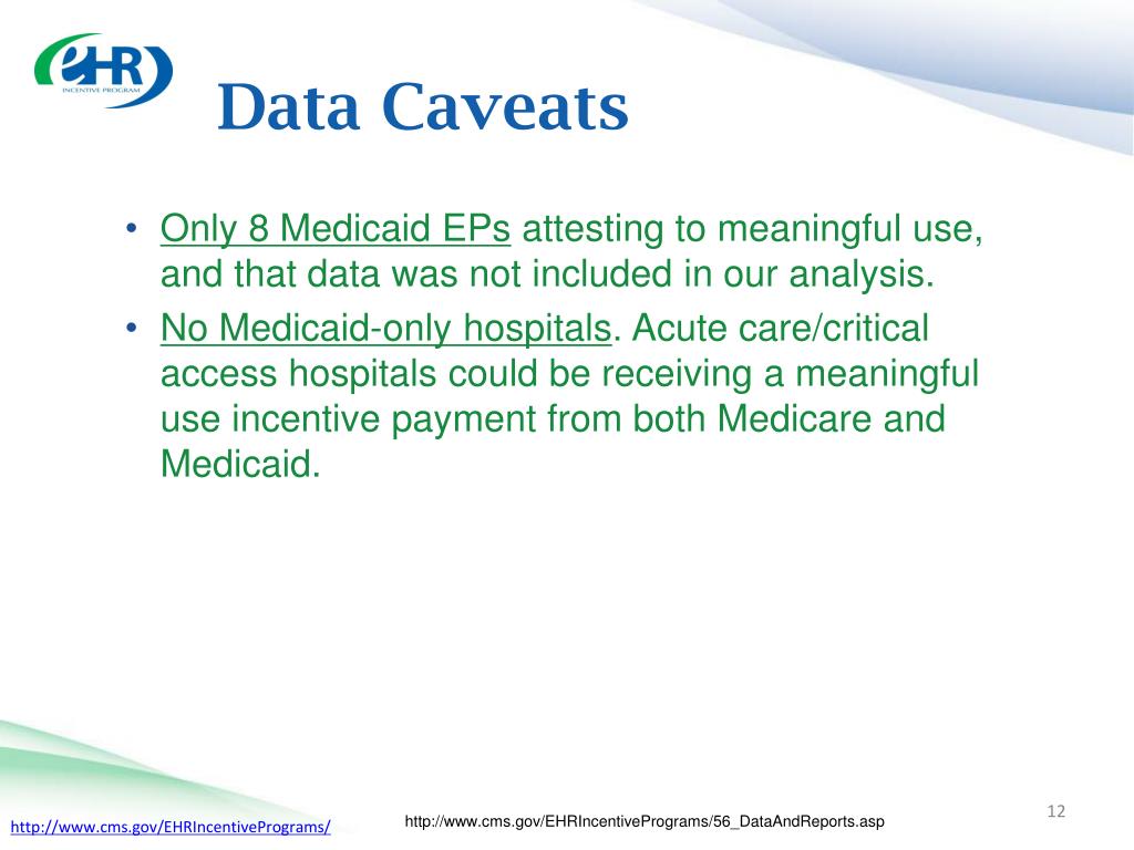 Data Caveats • Only 8 Medicaid EPs attesting to meaningful use, and that data was not included in our analysis. • No Medicaid-only hospitals. Acute care/critical access hospitals could be receiving a meaningful use incentive payment from both Medicare and Medicaid. http://www.cms.gov/EHRIncentivePrograms/56_DataAndReports.asp