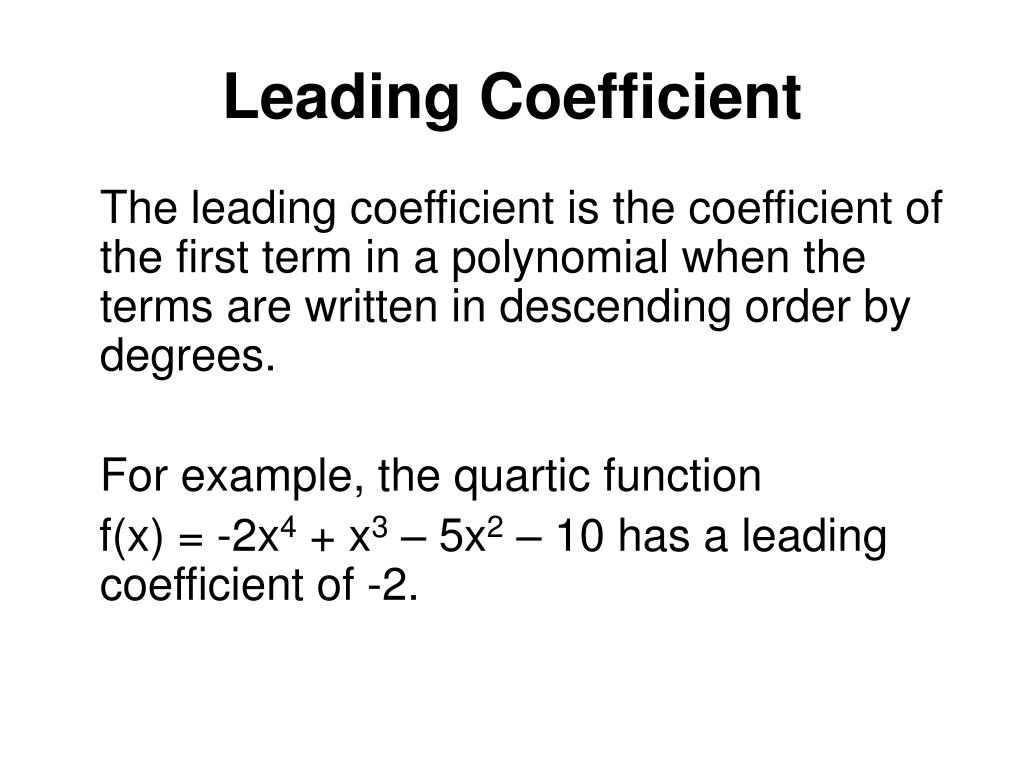 Leading Coefficient The leading coefficient is the coefficient of the first term in a polynomial when the terms are written in descending order by degrees. For example, the quartic function f(x) = -2x4 + x3 – 5x2 – 10 has a leading coefficient of -2.
