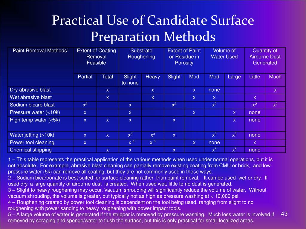 Practical Use of Candidate Surface Preparation Methods 1 – This table represents the practical application of the various methods when used under normal operations, but it is not absolute. For example, abrasive blast cleaning can partially remove existing coating from CMU or brick, and low pressure water (5k) can remove all coating, but they are not commonly used in these ways. 2 – Sodium bicarbonate is best suited for surface cleaning rather than paint removal. It can be used wet or dry. If used dry, a large quantity of airborne dust is created. When used wet, little to no dust is generated. 3 – Slight to heavy roughening may occur. Vacuum shrouding will significantly reduce the volume of water. Without vacuum shrouding, the volume is greater, but typically not as high as pressure washing at < 10,000 psi. 4 – Roughening created by power tool cleaning is dependent on the tool being used, ranging from slight to no roughening with power sanding to heavy roughening with power impact tools. 5 – A large volume of water is generated if the stripper is removed by pressure washing. Much less water is involved if removed by scraping and sponge/water to flush the surface, but this is only practical for small localized areas.
