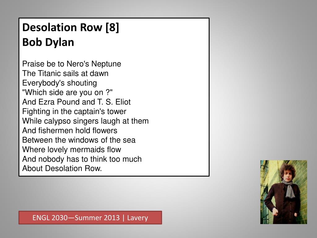 Desolation Row [8] Bob Dylan Praise be to Nero's NeptuneThe Titanic sails at dawnEverybody's shouting"Which side are you on ?"And Ezra Pound and T. S. EliotFighting in the captain's towerWhile calypso singers laugh at themAnd fishermen hold flowersBetween the windows of the seaWhere lovely mermaids flowAnd nobody has to think too muchAbout Desolation Row. ENGL 2030—Summer 2013 | Lavery