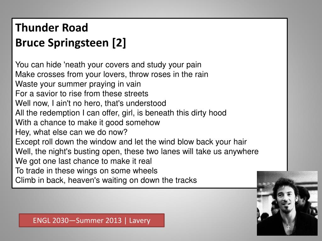 Thunder Road Bruce Springsteen [2] You can hide 'neath your covers and study your painMake crosses from your lovers, throw roses in the rainWaste your summer praying in vainFor a savior to rise from these streetsWell now, I ain't no hero, that's understoodAll the redemption I can offer, girl, is beneath this dirty hoodWith a chance to make it good somehowHey, what else can we do now?Except roll down the window and let the wind blow back your hairWell, the night's busting open, these two lanes will take us anywhereWe got one last chance to make it realTo trade in these wings on some wheelsClimb in back, heaven's waiting on down the tracks ENGL 2030—Summer 2013 | Lavery