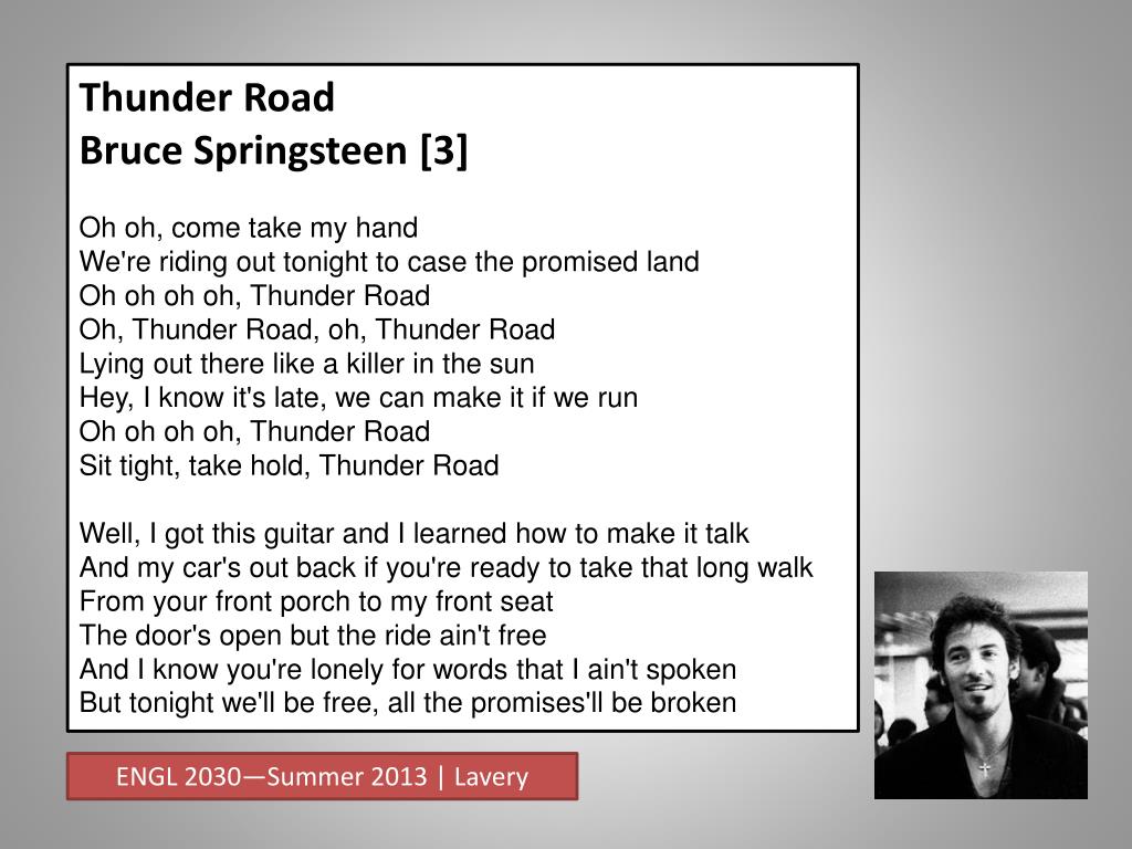 Thunder Road Bruce Springsteen [3] Oh oh, come take my handWe're riding out tonight to case the promised landOh ohohoh, Thunder RoadOh, Thunder Road, oh, Thunder RoadLying out there like a killer in the sunHey, I know it's late, we can make it if we runOh ohohoh, Thunder RoadSit tight, take hold, Thunder RoadWell, I got this guitar and I learned how to make it talkAnd my car's out back if you're ready to take that long walkFrom your front porch to my front seatThe door's open but the ride ain't freeAnd I know you're lonely for words that I ain't spokenBut tonight we'll be free, all the promises'll be broken ENGL 2030—Summer 2013 | Lavery
