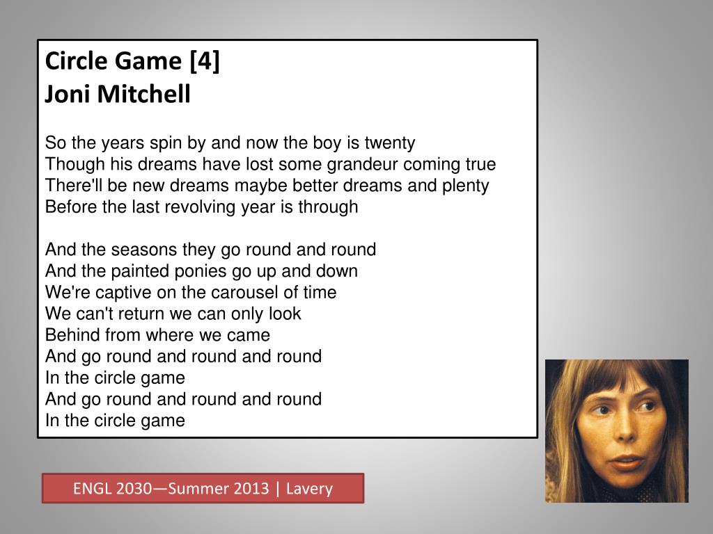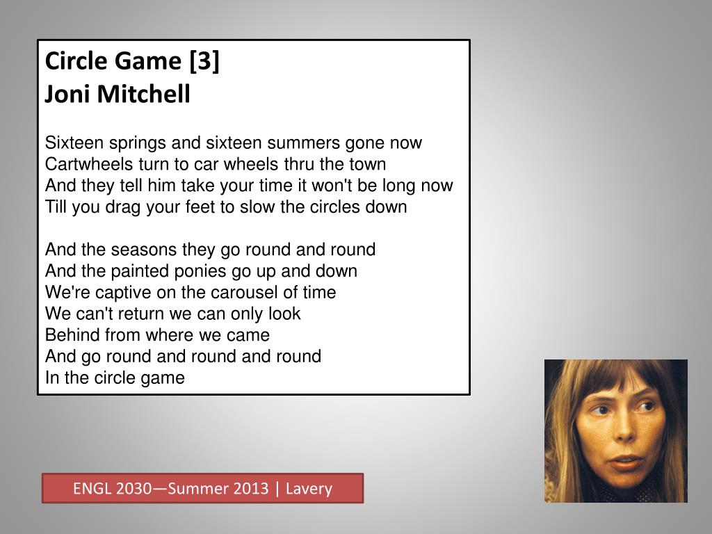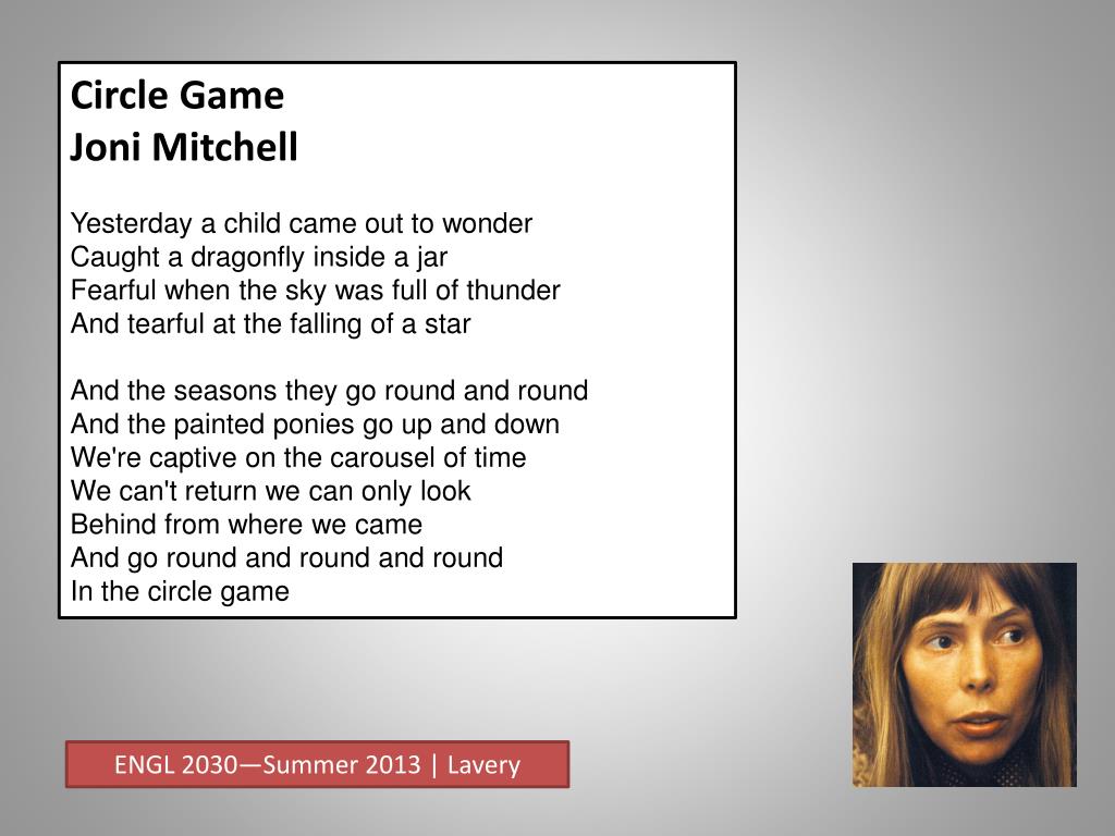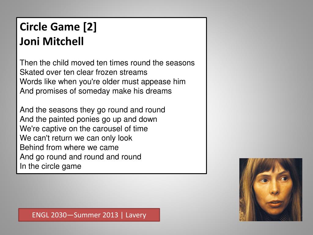 Circle Game [2] Joni Mitchell Then the child moved ten times round the seasonsSkated over ten clear frozen streamsWords like when you're older must appease himAnd promises of someday make his dreamsAnd the seasons they go round and roundAnd the painted ponies go up and downWe're captive on the carousel of timeWe can't return we can only lookBehind from where we cameAnd go round and round and roundIn the circle game ENGL 2030—Summer 2013 | Lavery