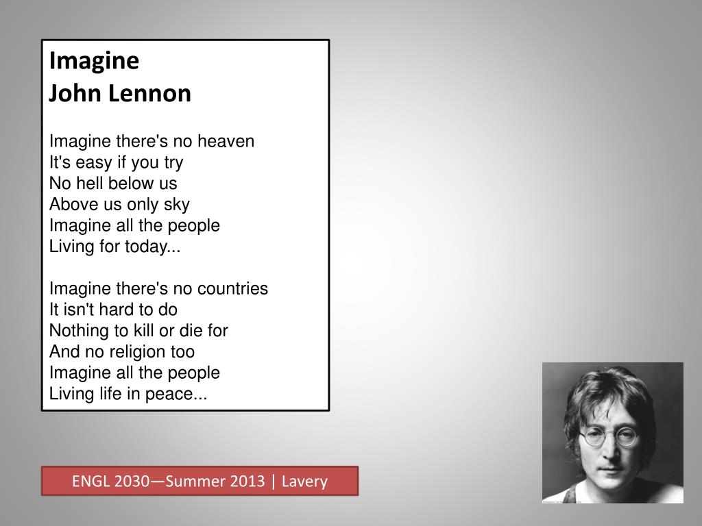 Imagine John Lennon Imagine there's no heavenIt's easy if you tryNo hell below usAbove us only skyImagine all the peopleLiving for today...Imagine there's no countriesIt isn't hard to doNothing to kill or die forAnd no religion tooImagine all the peopleLiving life in peace... ENGL 2030—Summer 2013 | Lavery