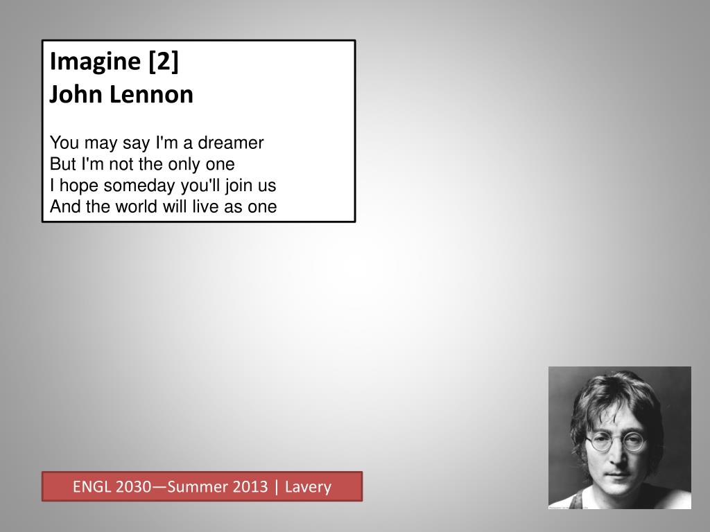 Imagine [2] John Lennon You may say I'm a dreamerBut I'm not the only oneI hope someday you'll join usAnd the world will live as one ENGL 2030—Summer 2013 | Lavery