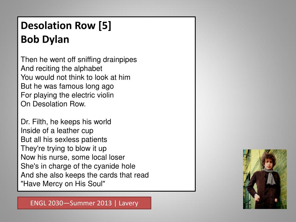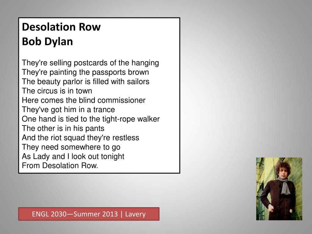 Desolation Row Bob Dylan They're selling postcards of the hangingThey're painting the passports brownThe beauty parlor is filled with sailorsThe circus is in townHere comes the blind commissionerThey've got him in a tranceOne hand is tied to the tight-rope walkerThe other is in his pantsAnd the riot squad they're restlessThey need somewhere to goAs Lady and I look out tonightFrom Desolation Row. ENGL 2030—Summer 2013 | Lavery