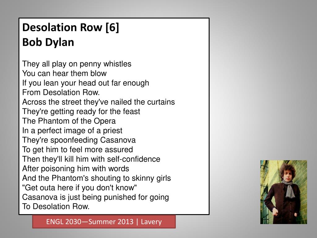 Desolation Row [6] Bob Dylan They all play on penny whistlesYou can hear them blowIf you lean your head out far enoughFrom Desolation Row.Across the street they've nailed the curtainsThey're getting ready for the feastThe Phantom of the OperaIn a perfect image of a priestThey're spoonfeeding CasanovaTo get him to feel more assuredThen they'll kill him with self-confidenceAfter poisoning him with wordsAnd the Phantom's shouting to skinny girls"Get outa here if you don't know"Casanova is just being punished for goingTo Desolation Row. ENGL 2030—Summer 2013 | Lavery