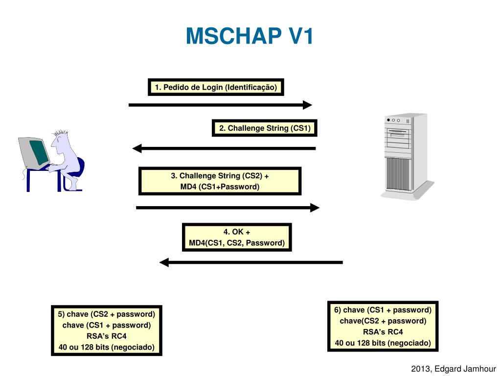 1. Pedido de Login (Identificação) 2. Challenge String (CS1) 3. Challenge String (CS2) + MD4 (CS1+Password) 4. OK + MD4(CS1, CS2, Password) MSCHAP V1 6) chave (CS1 + password) chave(CS2 + password) RSA’s RC4 40 ou 128 bits (negociado) 5) chave (CS2 + password) chave (CS1 + password) RSA’s RC4 40 ou 128 bits (negociado)