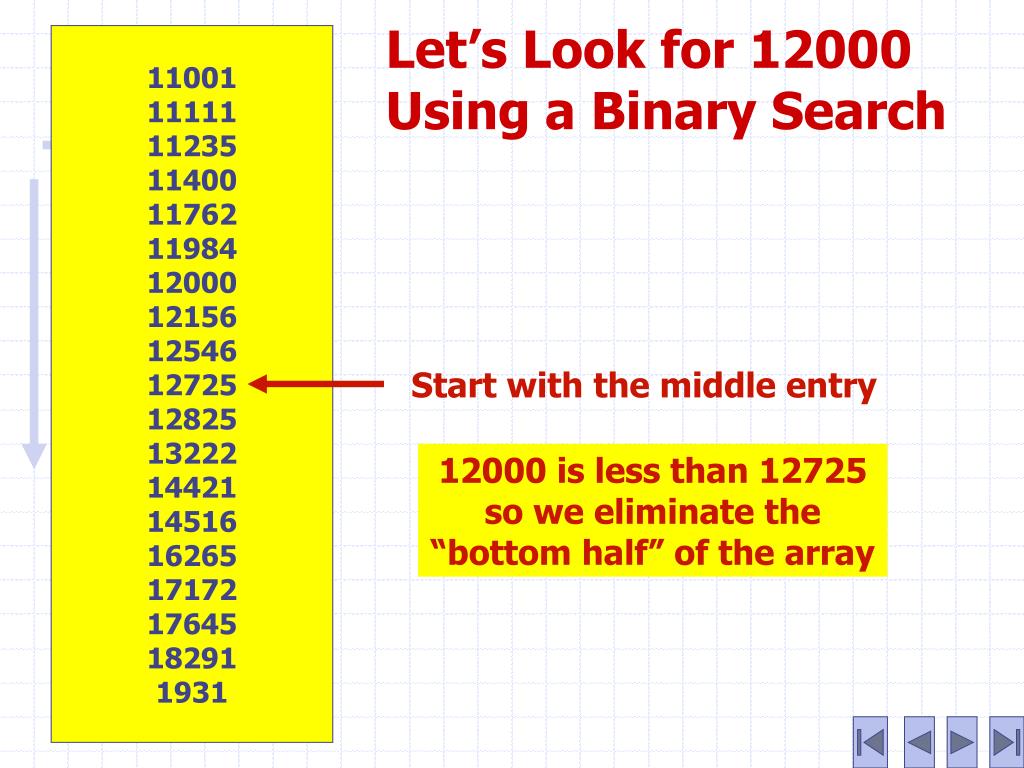 Start with the middle entry 11001 11111 11235 11400 11762 11984 12000 12156 12546 12725 12825 13222 14421 14516 16265 17172 17645 18291 1931 Let’s Look for 12000Using a Binary Search 12000 is less than 12725 so we eliminate the “bottom half” of the array