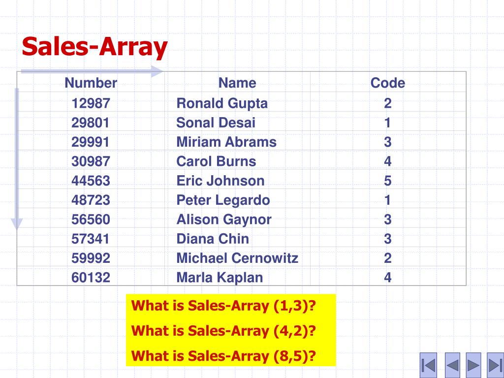 Number Name Code 12987 Ronald Gupta 2 29801 Sonal Desai 1 29991 Miriam Abrams 3 30987 Carol Burns 4 44563 Eric Johnson 5 48723 Peter Legardo 1 56560 Alison Gaynor 3 57341 Diana Chin 3 59992 Michael Cernowitz 2 60132 Marla Kaplan 4 Sales-Array What is Sales-Array (1,3)? What is Sales-Array (4,2)? What is Sales-Array (8,5)?